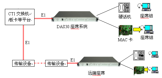 見下圖:DAS30通過1個(gè)E1接口與交換機(jī)/板卡直接連接,無需配置數(shù)據(jù),可方便地實(shí)現(xiàn)本地座席接入或遠(yuǎn)端分布式接入(需配合傳輸設(shè)備)。終端可為普通電話機(jī)或MAC座席電話卡。