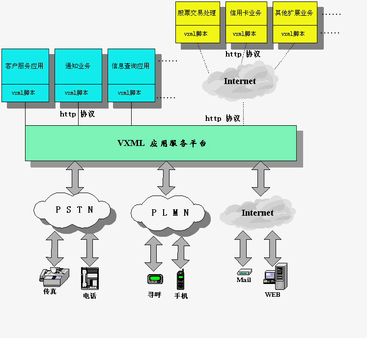 2000年3月由AT&T,Lucent,Motorola,IBM四家公司發(fā)起并提出的VoiceXML標(biāo)準(zhǔn)語言為語音增值業(yè)務(wù)的發(fā)展帶來了新的生機和變化。由于VoiceXML是XML語言的分支和子集,因此天然可以與因特網(wǎng)無縫連接。這使得傳統(tǒng)的語音業(yè)務(wù)可以無限擴展到龐大的互聯(lián)網(wǎng)體系中,可以真正“讓我們用聲音傾聽互聯(lián)網(wǎng)”。