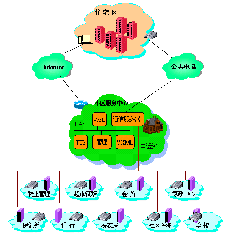 以國際標準的VXMLl技術(shù)為主導的小區(qū)服務中心系統(tǒng)可以與互聯(lián)網(wǎng)輕易地連通,從而為小區(qū)的服務網(wǎng)點走出小區(qū)的地域限制做好技術(shù)上的儲備。vxml的易開發(fā)和易擴展性,使得遠程服務的增加,幾乎不需要任何成本的追加,任何第三方服務提供者具備vxml業(yè)務,都可以直接掛到服務中心上來。