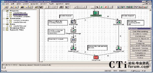 呼叫中心測(cè)試的第一步就是要?jiǎng)?chuàng)建要被測(cè)試的業(yè)務(wù)的呼叫流程圖?梢酝ㄟ^(guò)一個(gè)含有標(biāo)準(zhǔn)呼叫流程圖標(biāo)庫(kù)的呼叫流程圖形編輯器創(chuàng)建呼叫流程圖。每個(gè)呼叫流程的圖標(biāo)都包含一段Hammer
