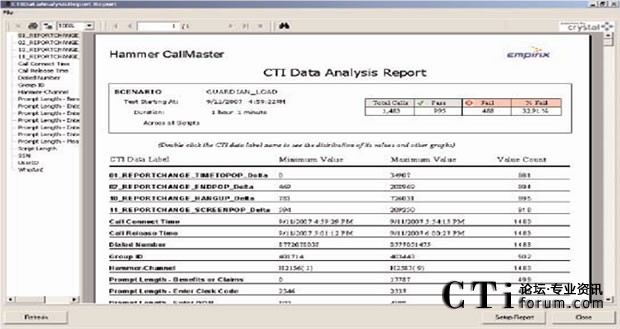如果響應(yīng)時(shí)間超過(guò)設(shè)定的預(yù)置值(閥值),或者發(fā)現(xiàn)任何其它問(wèn)題時(shí),Hammer可以把這個(gè)錯(cuò)誤和它的位置記錄在數(shù)據(jù)庫(kù)中,然后實(shí)時(shí)顯示測(cè)試結(jié)果。Hammer可以模擬呼叫流程中的任何一個(gè)方面,包括DTMF按鍵音可變信息的記錄或者是為測(cè)試支持語(yǔ)音識(shí)別系統(tǒng)而播放大量的語(yǔ)音文件。Hammer專(zhuān)利的語(yǔ)音提示識(shí)別能力更可以自動(dòng)檢驗(yàn)在IVR和ACD/PBX系統(tǒng)中是否正確播放語(yǔ)音提示。