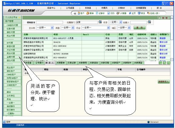 任我行-協(xié)同CRM把企業(yè)各部門與客戶交往過程中的所有記錄,比如業(yè)務記錄、業(yè)務員日程按排、客服記錄、銷售過程、工作報告、業(yè)務合同、銷售記錄、銷售費用等,進行這樣分類管理,這樣,就把企業(yè)離散的客戶資料統(tǒng)一管理起來,把企業(yè)個部門與客戶的銷售過程及服務等信息象珠子一樣串起來,而不是以前那種散亂、信息殘缺,讓查閱者對所需要關注的客戶"一目了然"。