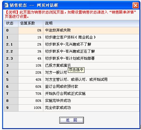 銷售過程量化管理,即對銷售活動進展的數(shù)字化。從目標客戶建立到簽約成交的過程中,按客戶需求變化以及我們提供咨詢的不同來分成若干個階段,我們把這些不同的階段描述出來,并用一個數(shù)字或百分比來替代。如:10%指的是客戶有這方面的需求意向,但對我們并沒有特別的關注;50%即可以表示需求強烈并偏愛于我們;而70%則可能到了談合作的相關條款等。這樣就讓本來靜止在紙上的業(yè)務報告變成了動態(tài)的分析數(shù)據(jù)。