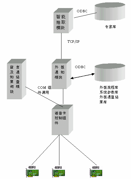 北京市建筑市場專家評標(biāo)抽取通知系統(tǒng)是靈訊科技有限公司采用加拿大Eicon網(wǎng)絡(luò)公司的Diva Server 4BRI 卡開發(fā)的一套高效的外撥通知系統(tǒng),該系統(tǒng)充分體現(xiàn)了Eicon網(wǎng)絡(luò)公司 Diva Server 4BRI卡強(qiáng)大的語音功能以及系統(tǒng)的穩(wěn)定性,準(zhǔn)確地識別了外撥手機(jī)的遇忙、無人、不再服務(wù)區(qū)、關(guān)機(jī)、空號等狀態(tài),實(shí)現(xiàn)了對手機(jī)狀態(tài)的全面監(jiān)控,全面解決了模擬語音卡對外撥手機(jī)信號無法判斷的問題。具體的系統(tǒng)架構(gòu)如下:![]()