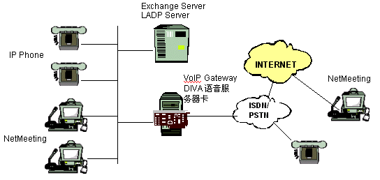 電話呼叫。在這種情況下,多于一個(gè)的電話連接可以同時(shí)在IP線路上通過(guò)數(shù)據(jù)包來(lái)傳送。通過(guò)使用G.723.1將語(yǔ)音進(jìn)行壓縮,傳送一路話音所需的帶寬將從64kbps(ISDN線路)減少到5.3kbps.如果在廣域連接中沒(méi)有足夠的帶寬或者廣域連接因?yàn)槟承┮蛟袛,我們(nèi)匀贿可以使用原來(lái)的PSTN來(lái)呼叫遠(yuǎn)端的辦公室。這就意味著用戶(hù)可以使用原來(lái)的服務(wù)方式而不僅僅只依賴(lài)于IP連接。所以,DIVA語(yǔ)音服務(wù)器的實(shí)施將通過(guò)提供附加的,低費(fèi)用的電話呼
