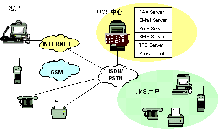 客戶(hù)用電子郵件、語(yǔ)音、尋呼、移動(dòng)短消息、傳真等與UMS用戶(hù)聯(lián)系,UMS中心啟動(dòng)相應(yīng)的服務(wù)與客戶(hù)建立連接,將客戶(hù)所發(fā)信息按識(shí)別標(biāo)識(shí)直接轉(zhuǎn)發(fā)到UMS用戶(hù)或中繼服務(wù)器,若因UMS用戶(hù)不在等原因,無(wú)法直接聯(lián)系,系統(tǒng)會(huì)提示客戶(hù)選擇別的方式聯(lián)系。也可將其存儲(chǔ),并進(jìn)行必要的格式轉(zhuǎn)換與管理,這時(shí)UMS中心可以主動(dòng)呼叫UMS用戶(hù)的手機(jī),傳真機(jī),電話等主動(dòng)將信息送到,UMS用戶(hù)也可以在任何時(shí)間、任何地點(diǎn),從固定電話網(wǎng)(普通電話、傳真機(jī)、IC卡電話等)、移動(dòng)網(wǎng)(GSM、模擬、CDMA、WAP手機(jī)、掌上電腦、PDA等)、尋呼網(wǎng)、互聯(lián)網(wǎng)(PC)訪問(wèn)中心服務(wù)器查詢(xún),索取個(gè)人信息。