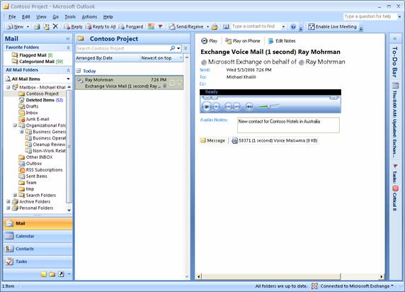 Outlook 2007,它將語音郵件作為優(yōu)先數(shù)據(jù)類型來集成。Outlook 2007 界面允許用戶連同其它數(shù)據(jù)項(xiàng)一起對語音郵件消息進(jìn)行排序、搜索和確定其優(yōu)先級;此外,用戶可以在他們的座機(jī)上播放語音郵件消息,并向語音郵件消息添加附注,以便連同關(guān)聯(lián)的發(fā)件人和日期信息一起對消息內(nèi)容建立索引。(請參見圖2)Outlook