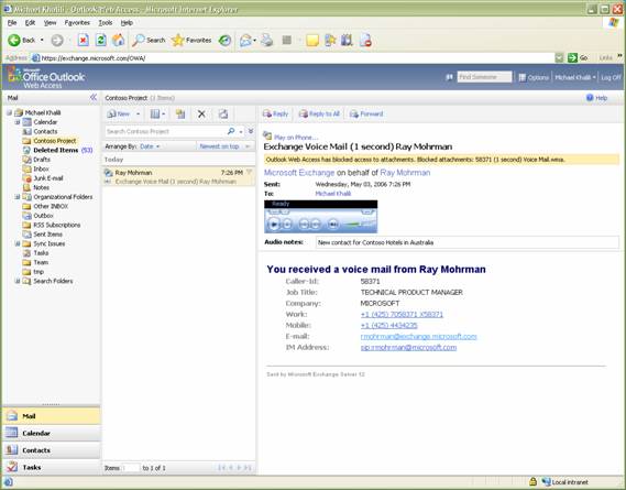 Outlook Web Access 2007,它允許用戶從瀏覽器會話中訪問語音郵件和傳真數(shù)據(jù)。OWA 2007 提供了對許多 Outlook 2007 功能的基于瀏覽器的無處不在的訪問,包括在計算機(jī)或電話機(jī)上回放語音郵件消息的能力和創(chuàng)建并收聽音頻附注的能力。(請參見圖3)