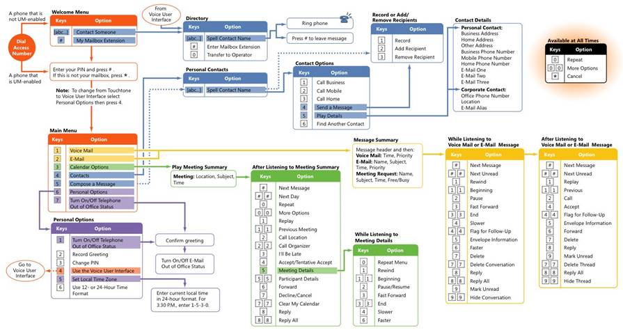 允許用戶通過電話處理他們的消息和日歷數(shù)據(jù)(包括收聽、轉(zhuǎn)發(fā)和回復(fù)電子郵件,以及發(fā)出、更新或響應(yīng)會議請求)。用戶可以標(biāo)記消息以便跟蹤、跳到下一封未讀郵件、隱藏或刪除對話,甚至查找來自特定用戶的消息,這一切全都使用語音導(dǎo)航或標(biāo)準(zhǔn)按鍵式鍵盤來完成。