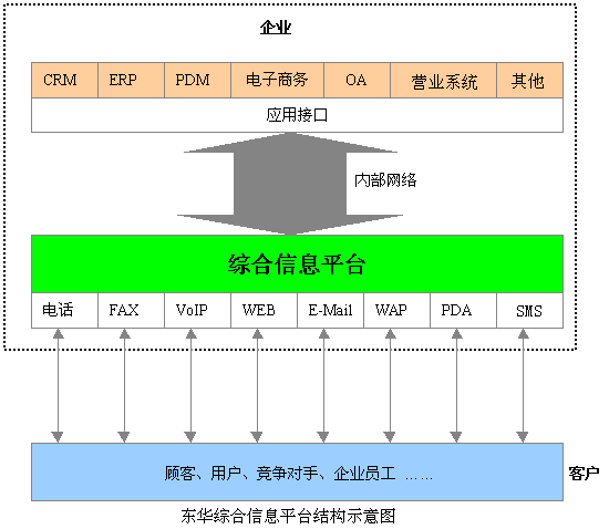 東華集團綜合信息平臺系統(tǒng)可集中企業(yè)客戶服務的優(yōu)勢資源,采用人工業(yè)務代表服務與自動語音服務相結合的形式,通過電話、Email、Web、尋呼、IP電話/傳真、視頻、段消息等接入方式和服務手段,向客戶提供業(yè)務受理、信息查詢、商品定購服務,以及接受客戶的咨詢、建議及投訴,也可以通過主動撥出做社會調(diào)查、市場調(diào)查、商品直銷及資費欠費催繳等。