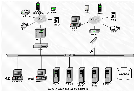 普通電話用戶通過PSTN接入DHC- UIPS綜合信息平臺系統(tǒng),接受話務員服務或自動業(yè)務流程。傳真用戶進入系統(tǒng)可以進行傳真業(yè)務。計算機用戶也可以通過Internet訪問企業(yè)客戶服務系統(tǒng)主頁,獲得服務。同時計算機用戶也可以通過Internet利用網(wǎng)絡電話的功能要求話務員服務或自動業(yè)務流程。