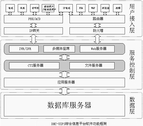 即DHC-UIPS綜合信息平臺的接入端,包括IVR流程、人工坐席等,它是用戶進入多媒體客服中心客服系統(tǒng)的入口,它將直接面對用戶并收集各種信息。支持電話、傳真、電子郵件、WEB訪問、WAP、PDA、IP電話、網(wǎng)絡電話、視頻電話等多種方式接入。