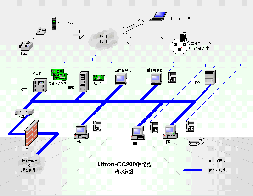 。。Utron-CC2000電信客戶服務(wù)中心系統(tǒng),支持傳統(tǒng)電話、傳真、電子郵件、Web等多種媒體呼叫接入,提供多種特服業(yè)務(wù)(112、114、170、180、189等)的綜合受理,從而實現(xiàn)電信客戶服務(wù)中心的基本建設(shè)目標(biāo):