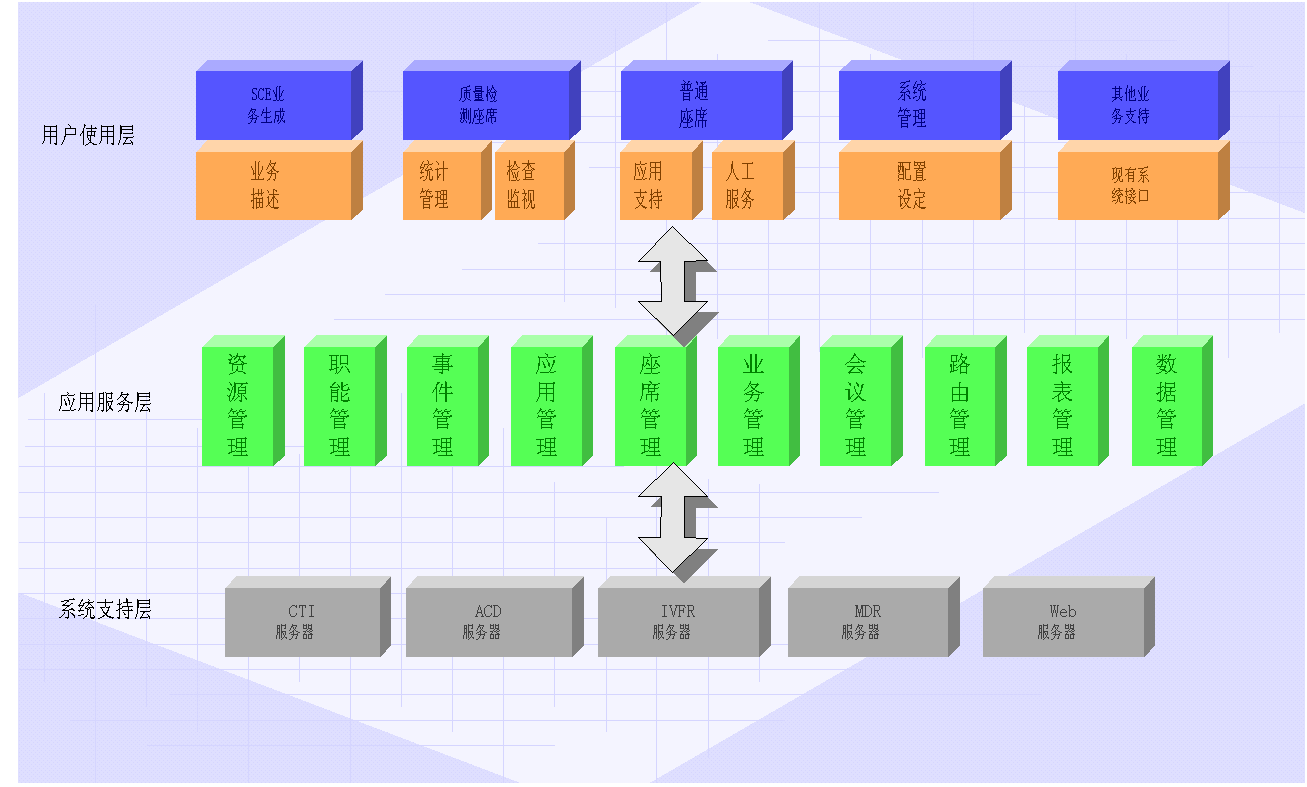 采用功能分散,統(tǒng)一管理的設(shè)計模式。各組件功能相對獨立,分布式處理各項事務(wù),它們的有機結(jié)合實現(xiàn)了功能完善的ACD服務(wù)器。各組件的預(yù)留接口提供了功能擴充的有效途徑。功能包括: