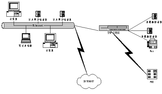 在一個有很多分支機(jī)構(gòu)的大企業(yè)的分部安裝Tw-IPBX ,通過IP 網(wǎng)絡(luò)與企業(yè)總部PBX 連接后后,可實(shí)現(xiàn)多種應(yīng)用,同時降低了成本。在這種應(yīng)用場景中,采用了基于IP 的傳輸機(jī)制(VoIP)。此種情況下VoIP的美好之處在于語音和數(shù)據(jù)的IP 傳輸管路需求(根據(jù)呼叫)的無縫可伸縮性,而無需任何靜態(tài)的分區(qū),這種解決方案可提供性能價格比極高且靈活的網(wǎng)絡(luò)運(yùn)作。
