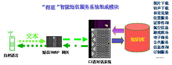 "得意"智能短信系統(tǒng)是在現(xiàn)有的數(shù)據(jù)通信和短信服務(wù)的技術(shù)平臺上,加入基于中文語言理解技術(shù)的"得意"口語對話系統(tǒng),從而能夠讓用戶在手機(jī)上以自然語言的形式享受指定領(lǐng)域的智能短信服務(wù)。智能短信系統(tǒng)對短信文本進(jìn)行自動(dòng)分析和理解,再從知識庫中提取用戶所需的信息,然后自動(dòng)產(chǎn)生智能應(yīng)答語句,并以短信文本的形式發(fā)回用戶。由于"得意"口語對話系統(tǒng)具有上下文相關(guān)理解和人機(jī)混合主導(dǎo)等強(qiáng)大功能,在規(guī)定的領(lǐng)域內(nèi),用戶可通過一個(gè)或者多個(gè)短信構(gòu)成一組對話,完成復(fù)雜的信息查詢或者其他互動(dòng)服務(wù)。