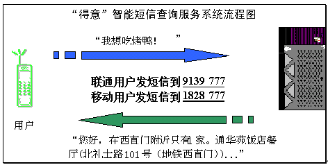 2004年4月15日和4月20日,擁有完全自主知識產(chǎn)權(quán)的語音與語言技術(shù)開發(fā)商和技術(shù)提供商北京得意音通技術(shù)有限責(zé)任公司(得意公司),在國際上率先把中文自然語言理解技術(shù)應(yīng)用在中國聯(lián)通和中國移動(dòng)短信服務(wù)平臺上,結(jié)合《精品購物指南》報(bào)社權(quán)威、全面的信息資源,開通了北京地區(qū)餐飲領(lǐng)域智能短信查詢服務(wù)(簡稱智能短信),并將進(jìn)一步支持互聯(lián)網(wǎng)平臺和WAP平臺,陸續(xù)開通更豐富和更實(shí)用的智能信息服務(wù)。