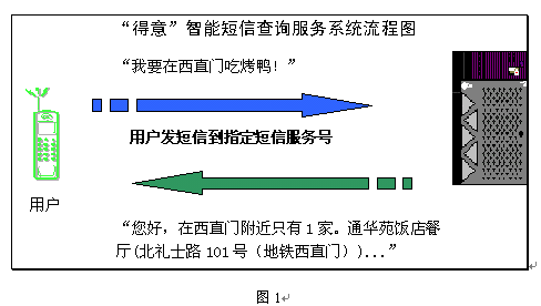 智能短信服務,就是允許短信用戶在手機上直接以自然語言的形式輸入文字(而不是輸入復雜的代碼或操作繁瑣的菜單),系統(tǒng)能迅速、準確地理解用戶的意思,提供周到的信息和服務。短信服務商可根據(jù)具體應用領域定制一系列全新的智能短信業(yè)務,如旅游交通、餐飲娛樂、金融證券、交友網(wǎng)聚、智力競猜等受歡迎的服務,將直接刺激用戶使用短信服務的興趣和頻率。得意公司提供的北京餐飲智能短信服務可以靈活、方便地引導用戶找到合適的餐飲信息(圖1)
