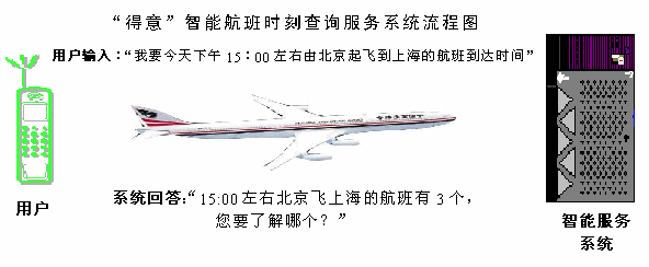 使用"得意"智能航班時刻查詢服務系統(tǒng),用戶可以通過短信/WAP/互聯(lián)網(wǎng)以自然語言的方式與服務系統(tǒng)進行互動,方便地查詢各個航班的時刻,以及相關的信息。當用戶在對話過程中遇到困難時,系統(tǒng)還會主動引導用戶獲取想要的信息,能為乘客和交通機構提供很好的服務手段,實現(xiàn)真正的"智能"。
