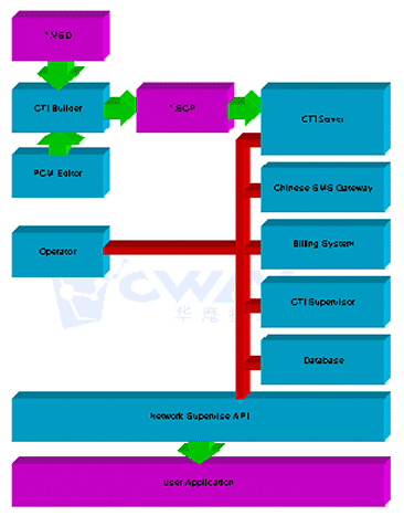 說(shuō)明:圖中所有的設(shè)備都是通過(guò)網(wǎng)絡(luò)和CTI服務(wù)器交互的,我們內(nèi)部都是通過(guò)遠(yuǎn)程監(jiān)控API接口與服務(wù)器通信,也就是說(shuō),只要用戶(hù)可以按照遠(yuǎn)程監(jiān)控API的規(guī)范開(kāi)發(fā)出具有自己特色的計(jì)費(fèi)系統(tǒng)、監(jiān)控系統(tǒng)等等。