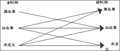 主/被叫黑白名單是號碼防火墻的一種簡易實現(xiàn)方式。黑白名單能夠在有限分類的情況下,提供相對豐富的權限控制能力。具體說,黑白名單就是把電話號碼分為三類,并定義這些分類之間的呼叫限制。(如圖2)