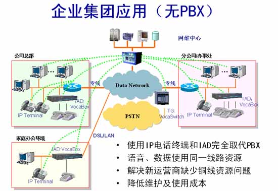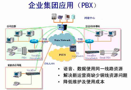 在總部、各個(gè)分公司、辦事處按照容量的大小可以安裝多臺(tái)VocaBox/IAD,并利用VocaBox自帶的FXO接口與本地PSTN網(wǎng)互通,在總部可用VocaSwitch的E1接口與PSTN互通。