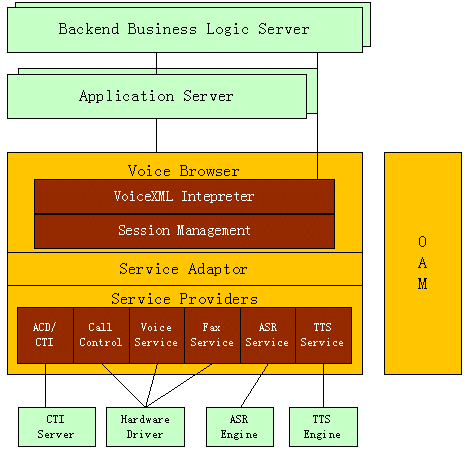 用于存放和產(chǎn)生VoiceXML腳本,可以是文件系統(tǒng)或WEB服務(wù)器,一般文件系統(tǒng)應(yīng)用于靜態(tài)腳本,WEB服務(wù)器應(yīng)用于動(dòng)態(tài)腳本;應(yīng)用邏輯組件或中間件,進(jìn)行事務(wù)處理。