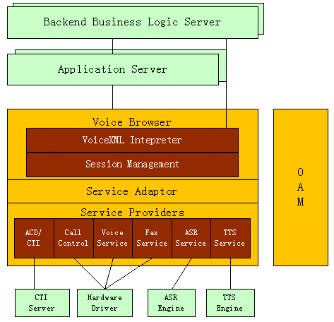 o 功能豐富:支持VoiceXML 2.0的全部現(xiàn)有功能,支持主流PBX、CTI中間件、語音呼入\出、傳真等功能,支持語音識(shí)別(ASR)和語音合成技術(shù)(TTS)。