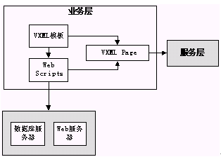 Scripts(ASP,JSP等)語言訪問外部系統(tǒng)以獲取數(shù)據(jù),把這些數(shù)據(jù)合并到VXML的模板中,形成完整的業(yè)務(wù)流程。服務(wù)層獲得該業(yè)務(wù)流程后,就可以按照該流程和用戶進行交互。