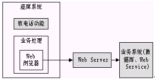 從上圖可以看出,座席端所有的業(yè)務處理都是在Web瀏覽器上進行的,所以無論是利用原有系統(tǒng)還是新開發(fā)系統(tǒng),用戶都不必要關心座席的具體實現(xiàn)方式,要做的僅僅是編寫新的JSP,ASP等可訪問后臺業(yè)務的Web頁面,然后進行簡單的配置就可以完成業(yè)務的擴充功能。