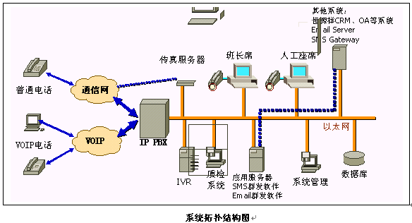 《恒源祥(集團)有限公司呼叫中心》采用聲軟網(wǎng)絡技術公司的《XIPCC呼叫中心系統(tǒng)》平臺,主要由NBX IP交換機、IVR系統(tǒng)、應用服務器、數(shù)據(jù)庫服務器(共用CRM的數(shù)據(jù)庫服務器)、全程錄音系統(tǒng)和PC終端座席系統(tǒng)等硬件設備和系統(tǒng)應用軟件組成。它以電話服務為主要服務方式、結合計算機信息系統(tǒng)的資料數(shù)據(jù),為客戶提供全方位的服務,包括:信息查詢、客戶咨詢、調查反饋、產(chǎn)品導購、投訴、舉報、產(chǎn)品和活動的發(fā)布以及客戶關懷等功能。