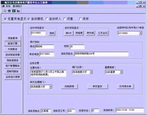 。。客戶打入電話后,當(dāng)系統(tǒng)的自動語音應(yīng)答子系統(tǒng)無法解決客戶問題時,客戶可選擇人工服務(wù),由航空公司客戶服務(wù)代表直接接聽客戶電話,處理并解決客戶問題。此時客戶同座席話務(wù)人員直接溝通,并同時記錄下該客戶的聯(lián)系方式,將相關(guān)數(shù)據(jù)添加入系統(tǒng)數(shù)據(jù)庫;也可以在數(shù)據(jù)庫的支持下回答機場航班/航空貨運信息及相關(guān)規(guī)定等的咨詢和疑問、訂座/訂艙。客戶也可以選擇自動語音服務(wù)方式,根據(jù)系統(tǒng)的語音提示輸入按鍵,選擇類別,將自己的投訴和建議以及自己的聯(lián)系方式信息以留言錄音的方式保存在系統(tǒng)中。系統(tǒng)同時還支持自動傳真方式,客戶可以通過傳真機進入本系統(tǒng),通過按鍵選擇傳真方式,將自己的意見建議等的文本內(nèi)容傳真給系統(tǒng),系統(tǒng)自動接受并存入數(shù)據(jù)庫。