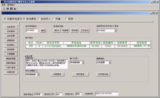 。。提供電話、傳真、電子郵件、因特網(wǎng)、手機、網(wǎng)絡(luò)電話等多種通訊方式接入和呼出,全天候24小時服務(wù);無論以何種方式接入系統(tǒng),都可以用統(tǒng)一的方式進行后臺處理,全面體貼居民的需要,有效擴大電力系統(tǒng)的服務(wù)范圍!