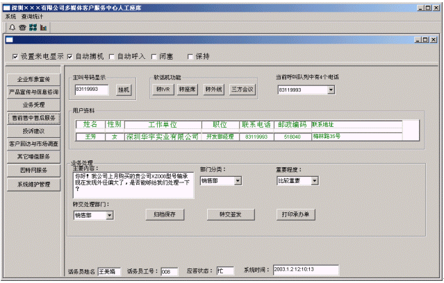 系統(tǒng)管理人員依據(jù)當(dāng)前的狀態(tài)監(jiān)控顯示掌握當(dāng)前系統(tǒng)的工作狀況,如忙閑程度、業(yè)務(wù)分布、業(yè)務(wù)代表狀態(tài)、線路狀態(tài)等。領(lǐng)導(dǎo)決策人員依據(jù)對呼叫信息的歷史統(tǒng)計,進(jìn)行針對性的決策,決定系統(tǒng)的規(guī)模、人員數(shù)量等的調(diào)整,以提高系統(tǒng)的運(yùn)行效率和服務(wù)質(zhì)量。