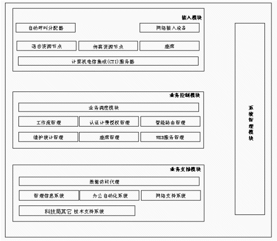 接入模塊負責提供所有用戶的接入,包括電話用戶、傳真用戶、因特網(wǎng)用戶、手機用戶、網(wǎng)絡(luò)電話用戶等的接入,實現(xiàn)"交換平臺"與外部系統(tǒng)的連接,并把各種不同的接入方式轉(zhuǎn)化為標準的請求/響應(yīng)格式。使得用戶能根據(jù)自己的要求向科技局客戶服務(wù)中心提出服務(wù)請求,然后進行業(yè)務(wù)受理并作業(yè)務(wù)解析,并根據(jù)解析結(jié)果從業(yè)務(wù)控制層調(diào)用相應(yīng)的業(yè)務(wù)流程(包括語音流程、計費流程等)為用戶提供服務(wù)。