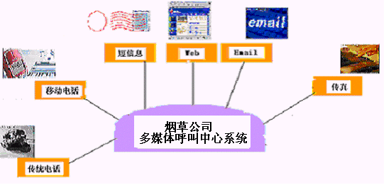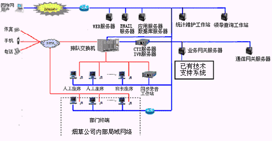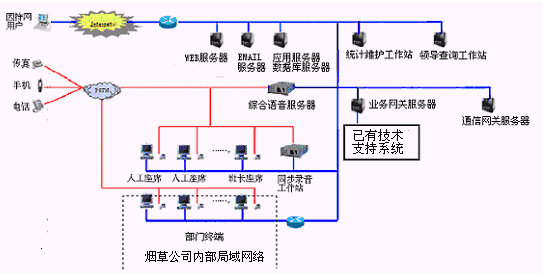 卷煙經(jīng)銷戶等客戶利用電話、傳真、電子郵件、因特網(wǎng)、手機(jī)、短消息等撥打統(tǒng)一的特服號(hào)碼(如800XXX或9XXXX)進(jìn)入煙草公司呼叫中心,本系統(tǒng)依托煙草公司各類業(yè)務(wù)技術(shù)支持系統(tǒng)和網(wǎng)絡(luò)系統(tǒng),實(shí)現(xiàn)煙草專賣局原有管理系統(tǒng)/業(yè)務(wù)系統(tǒng)及數(shù)據(jù)庫(kù)的無(wú)縫連接,通過(guò)人工受理或自動(dòng)語(yǔ)音服務(wù)等方式全天24小時(shí)不間斷地為客戶提供各種服務(wù)。