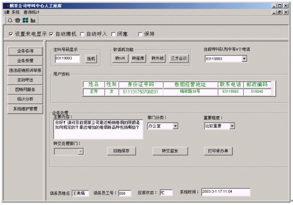 煙草公司呼叫中心將接入功能、導(dǎo)航功能、自動(dòng)語(yǔ)音查詢功能、人工座席服務(wù)功能、話路轉(zhuǎn)接功能、信息資料處理緊密聯(lián)系起來(lái)。用戶撥打特服電話號(hào)碼后,可以根據(jù)需要選擇人工服務(wù)、自動(dòng)語(yǔ)音查詢、自動(dòng)留言,并能夠在幾種服務(wù)中來(lái)回切換或轉(zhuǎn)接其它電話;所記錄的資料可以分門別類的進(jìn)行統(tǒng)計(jì)并形成報(bào)表,供相關(guān)部門進(jìn)行檢索查閱;意見處理完畢,可由座席主動(dòng)呼叫用戶,告知處理意見,形成閉環(huán)處理流程。