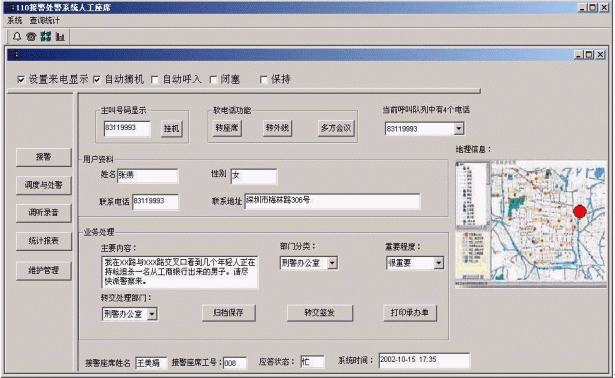 深圳博宇科技公司 110無線報警定位調(diào)度系統(tǒng)人工接警座席示意性界面如下: