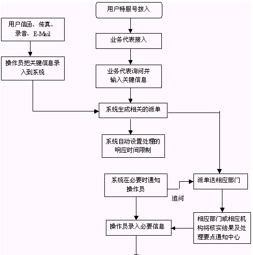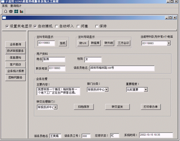 人民群眾打入電話后,當系統(tǒng)的自動語音應答子系統(tǒng)無法解決客戶問題時,客戶可選擇人工服務,由企業(yè)客戶服務代表直接接聽客戶電話,處理并解決客戶問題。此時客戶同座席話務人員直接溝通,并同時記錄下該客戶的聯(lián)系方式,將相關(guān)數(shù)據(jù)添加入系統(tǒng)數(shù)據(jù)庫;也可以在數(shù)據(jù)庫的支持下回答質(zhì)量監(jiān)督咨詢、投訴等?蛻粢部梢赃x擇自動語音服務方式,根據(jù)系統(tǒng)的語音提示輸入按鍵,選擇類別,將自己的投訴和建議以及自己的聯(lián)系方式信息以留言錄音的方式保存在系統(tǒng)中。系統(tǒng)同時還支持自動傳真方式,客戶可以通過傳真機進入本系統(tǒng),通過按鍵選擇傳真方式,將自己的意見建議等的文本內(nèi)容傳真給系統(tǒng),系統(tǒng)自動接受并存入數(shù)據(jù)庫。