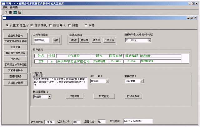 (2)提高家電企業(yè)親切感:系統(tǒng)在人工服務(wù)狀態(tài)下,當(dāng)業(yè)務(wù)代表輸入客戶名稱時(shí),系統(tǒng)即時(shí)將客戶與家電企業(yè)相關(guān)的信息顯示在座席終端上,使業(yè)務(wù)及時(shí)了解客戶,有針對(duì)性回答客戶問(wèn)題,使客戶倍感親切。