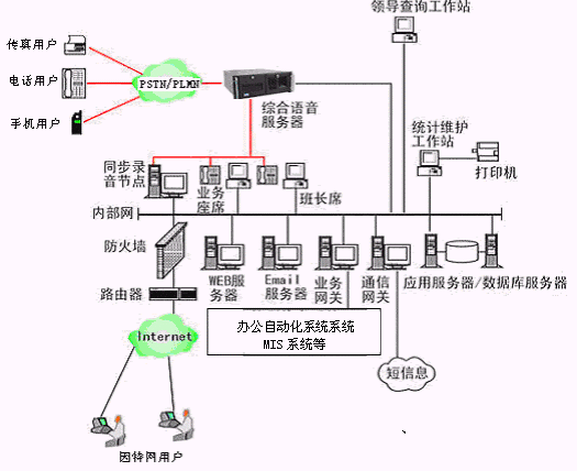 整個(gè)多媒體呼叫中心系統(tǒng)對(duì)外面向用戶(hù),對(duì)內(nèi)與整個(gè)市勞動(dòng)局相聯(lián)系,與內(nèi)部管理/服務(wù)等結(jié)為一體,能夠把從用戶(hù)那里獲得的各種信息、數(shù)據(jù)全部貯存在龐大的數(shù)據(jù)倉(cāng)庫(kù)中,供領(lǐng)導(dǎo)者作分析和決策之用;形成了對(duì)外服務(wù)于客戶(hù),對(duì)內(nèi)管理、分析、決策系統(tǒng)相結(jié)合的多媒體呼叫中心。