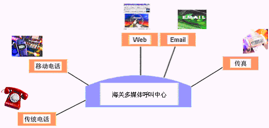 客戶利用電話、傳真、電子郵件、因特網(wǎng)、手機(jī)等撥打某一特服號(hào)碼(如9xxxx)進(jìn)入海關(guān)多媒體呼叫中心系統(tǒng),本系統(tǒng)依托海關(guān)緝私相關(guān)的MIS系統(tǒng)、OA度系統(tǒng)等各類業(yè)務(wù)技術(shù)支持系統(tǒng)和網(wǎng)絡(luò)系統(tǒng),通過自動(dòng)語音服務(wù)或人工受理等方式全天24小時(shí)不間斷地為客戶提供各種服務(wù)。
