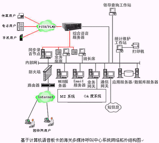 本多媒體呼叫中心的物理結(jié)構(gòu)由帶語音板卡的高工控機(jī)、CTI服務(wù)器、IVR(交互式語音應(yīng)答)/IFR(交互式傳真應(yīng)答)服務(wù)器、業(yè)務(wù)代表座席(邏輯上分為:普通業(yè)務(wù)代表座席、專家座席、WEB座席等)、班長(zhǎng)座席/質(zhì)檢座席、統(tǒng)計(jì)維護(hù)管理工作站、因特網(wǎng)(WEB)服務(wù)器、電子郵件(EMAIL)服務(wù)器、數(shù)據(jù)庫/應(yīng)用服務(wù)器、錄音留言工作站、領(lǐng)導(dǎo)查詢工作站、業(yè)務(wù)網(wǎng)關(guān)服務(wù)器、通信網(wǎng)關(guān)服務(wù)器、網(wǎng)絡(luò)系統(tǒng)等和應(yīng)用軟件構(gòu)成。