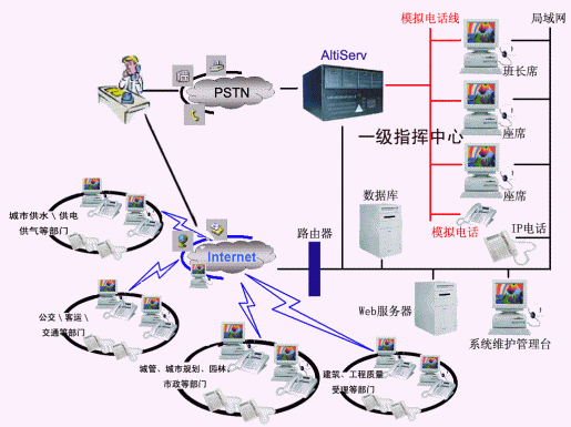該熱線系統(tǒng)能與Internet、數(shù)據(jù)庫系統(tǒng)很好地集成,實(shí)現(xiàn)城市各級部門之間數(shù)據(jù)共享和各種其它不同的業(yè)務(wù)功能,以建設(shè)部為中心、各職能聯(lián)動(dòng)2級網(wǎng)絡(luò)系統(tǒng)和搶修維護(hù)服務(wù)端三個(gè)部分組成,利用AltiCenter基于IP的分布式呼叫中心技術(shù),可以實(shí)現(xiàn)建設(shè)部12319服務(wù)中心,屬下各個(gè)職能部門建立異地分中心,利用現(xiàn)有的PSTN電話網(wǎng)/INTERNET互聯(lián)網(wǎng),將1,2,3級網(wǎng)絡(luò)組成一個(gè)集語音和數(shù)據(jù)傳輸為一體的多媒體網(wǎng)絡(luò)系統(tǒng),并提供對任何方式的服務(wù)進(jìn)行全程錄音、質(zhì)檢功能,最終結(jié)果反饋到統(tǒng)一指揮服務(wù)中心。
