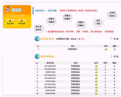 彩話業(yè)務(wù)系統(tǒng)BYBGM2.0功能強大,它允許將被叫分為不同的組或者將其設(shè)置為特殊號碼,這樣將可以設(shè)置他們的默認背景音樂,還可以針對他們設(shè)置紀念日或者按照不同的時段設(shè)置不同的背景音樂。當用戶喜歡幾首音樂但又不希望每次都聽相同的音樂時,可以將一定數(shù)目的音樂設(shè)置為一個音樂盒(Music-Box),這樣系統(tǒng)會每次到音樂盒中隨機選取一首音樂作為彩話背景音樂。系統(tǒng)中提供的音樂素材不能滿足用戶的需求時,用戶可以通過"彩話DIY"服務(wù)自己錄制音樂素材到系統(tǒng)中或?qū)⒅付ǜ袷降囊魳匪夭纳蟼鞯较到y(tǒng)中,充分展現(xiàn)自己的個性和創(chuàng)作才華。在通話過程中,用戶也可以隨心所欲控制彩話,這就是"隨心變奏"服務(wù),通過它用戶可以在通話過程中變換彩話背景音樂或音量的大小,這就使得用戶甚至可以編制一個通話場景(不同的背景音樂、不同的音效),并可以根據(jù)被叫的反應(yīng)及時加以控制,從而得以充分展現(xiàn)自己的通話魅力。