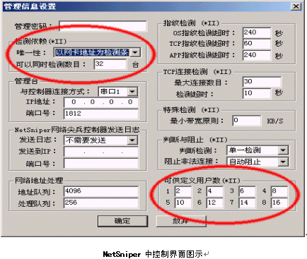 由上圖我們可以看出,NetSniper可以方便地根據(jù)用戶IP地址或MAC地址控制同一網(wǎng)口用戶數(shù)量,用戶數(shù)量控制可以分八級,包括單一用戶和無限用戶的缺省設(shè)置,一共十級。用戶數(shù)量按照按自己的意愿定義每一級用戶可以管理計算機的數(shù)量,準(zhǔn)確,靈活,是運營商增加接入服務(wù)方式的強大基礎(chǔ)。
