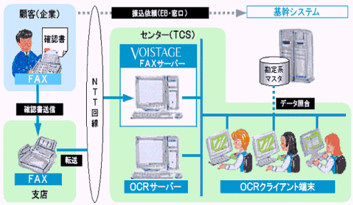 系統(tǒng)結構中心每天收到FAX7~800張?蛻魯(shù)約 1,400家。系統(tǒng)配置是有VOISTAGE(VS-403MC)功能的FAX服務器和OCR
