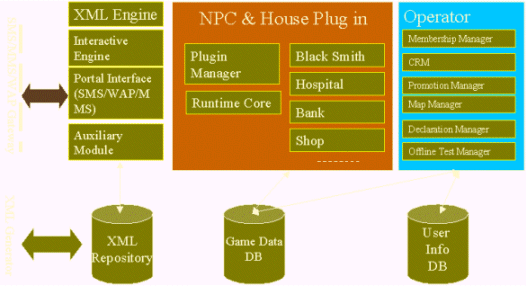 基于上述的因素,北京市萬隆然博科技有限責(zé)任公司率先在國內(nèi)推出了無線互連游戲平臺,把游戲的快速開發(fā)、游戲的運行引擎和游戲的客戶服務(wù)管理集成在一體。方便了短訊運營商的運營。同時,然博科技通過分析各類游戲的特點和無線交互方式的特點。具有獨創(chuàng)性的推出了一種游戲描述XML格式。通過然博科技提供的離線工具,游戲策劃人可以自己編寫腳本,自己定義場景,進(jìn)行仿真。同時,上傳到實際運行的服務(wù)器端。真正的實現(xiàn)了短信門戶的個人創(chuàng)作工具。使得短信門戶真正的可以與傳統(tǒng)的Web門戶有相同的運營模式。ICP可以通過出賣短信服務(wù)器的硬盤空間來實現(xiàn)與內(nèi)容宿主共同盈利的模式。