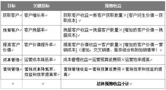 "效益目標(biāo)" 這一戰(zhàn)略考慮是設(shè)定企業(yè)客戶(hù)關(guān)系管理戰(zhàn)略中的針對(duì)細(xì)分客戶(hù)的收益目標(biāo),與之相關(guān)聯(lián)的戰(zhàn)略重點(diǎn)是最大化針對(duì)細(xì)分客戶(hù)的客戶(hù)價(jià)值。這一部分將對(duì)以后工作中的客戶(hù)關(guān)系管理客戶(hù)收益提供方向和評(píng)估方法。