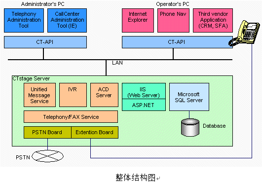 隨著經營環(huán)境和企業(yè)環(huán)境的日益激化,作為新時代的信息策略,計算機電話集成(CTI)也由于投資小效益大而倍受注目。沖電氣公司的CTstage實現(xiàn)最先端的多媒體通信的UnPBX(在服務器中加插電話板卡,以單臺計算機實現(xiàn)PBX功能的系統(tǒng))型的開放式CTI系統(tǒng)。在一臺PC服務器上實現(xiàn)IVR和ACD功能、內線電話控制、ACD監(jiān)視器等呼叫中心所需要的功能,成為真正意義上的UnPBX呼叫中心。先進的CTI的解決方案將作為企業(yè)的經營策略,迅速提高適應市場的能力。